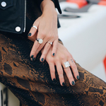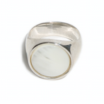 This is our 'Everett' ring from our Flat Top collection. It's flat, circular is face adorned with a 15mm White Mother of Pearl. The 'Everett' ring combines practicality and edge. This unisex signet ring is a go-to piece with endless wearability.