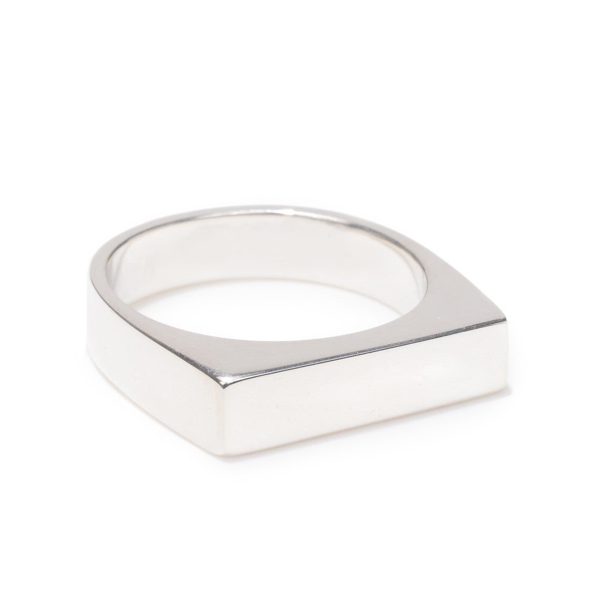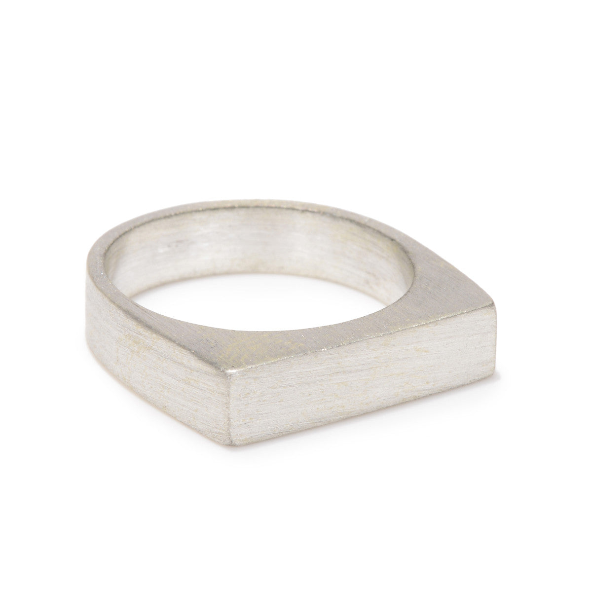 On trend with the aesthetically pleasing angles, the 'Bernard' is a slick rectangular shaped ring and has been adorned with a single simple 2 mm White Diamond. This piece from 'the Thomas collection' brings a modern element to a clean design. Contact us here for custom sizing!