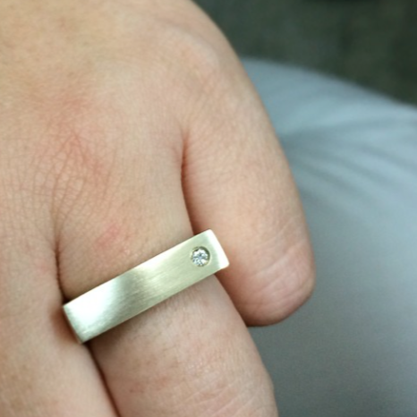 On trend with the aesthetically pleasing angles, the 'Bernard' is a slick rectangular shaped ring adorned with a single simple 2mm Diamond. Available in Sterling Silver, White Bronze, and Yellow Brass with either a shiny or satin finish. This piece from 'the Thomas collection' brings a modern element to a clean design.