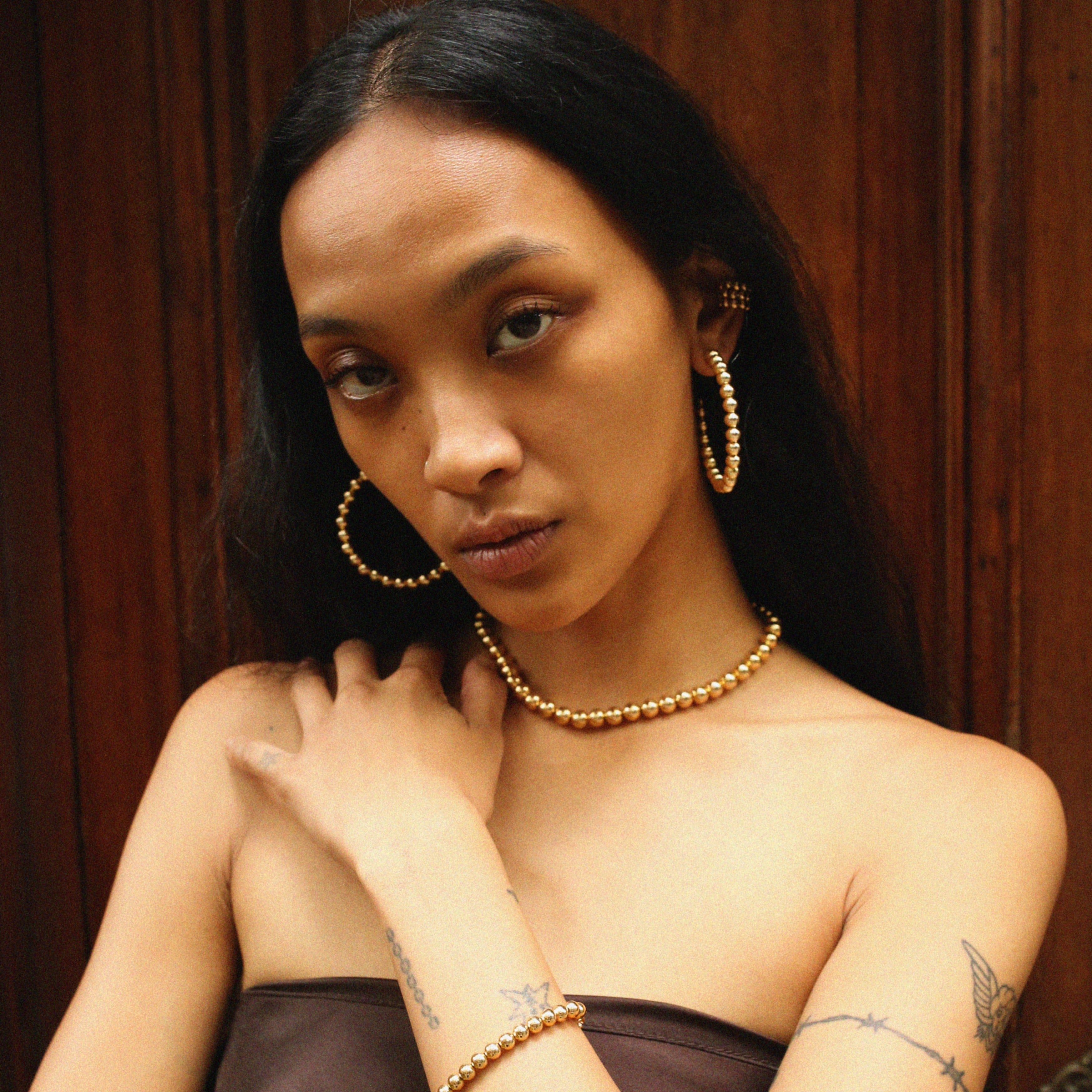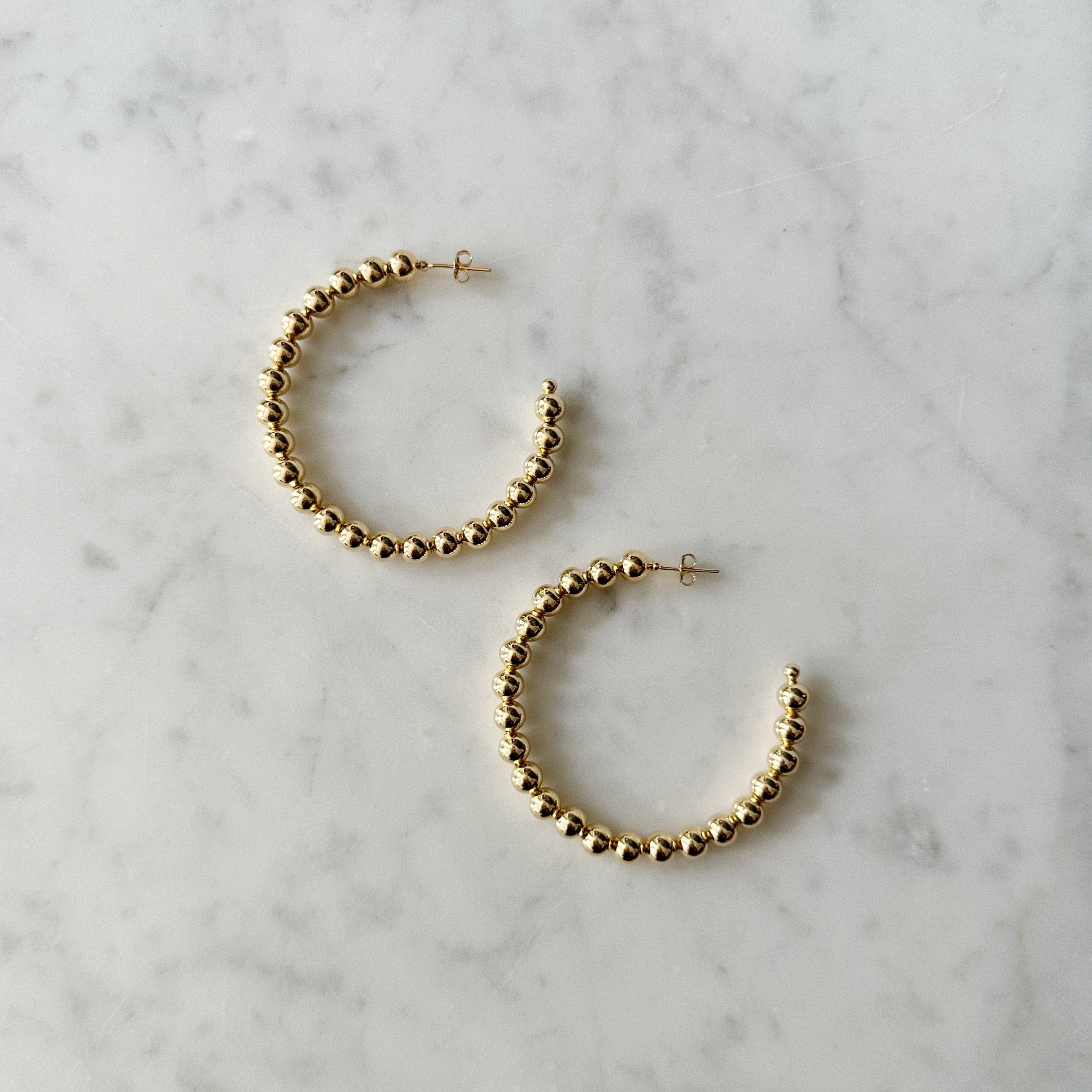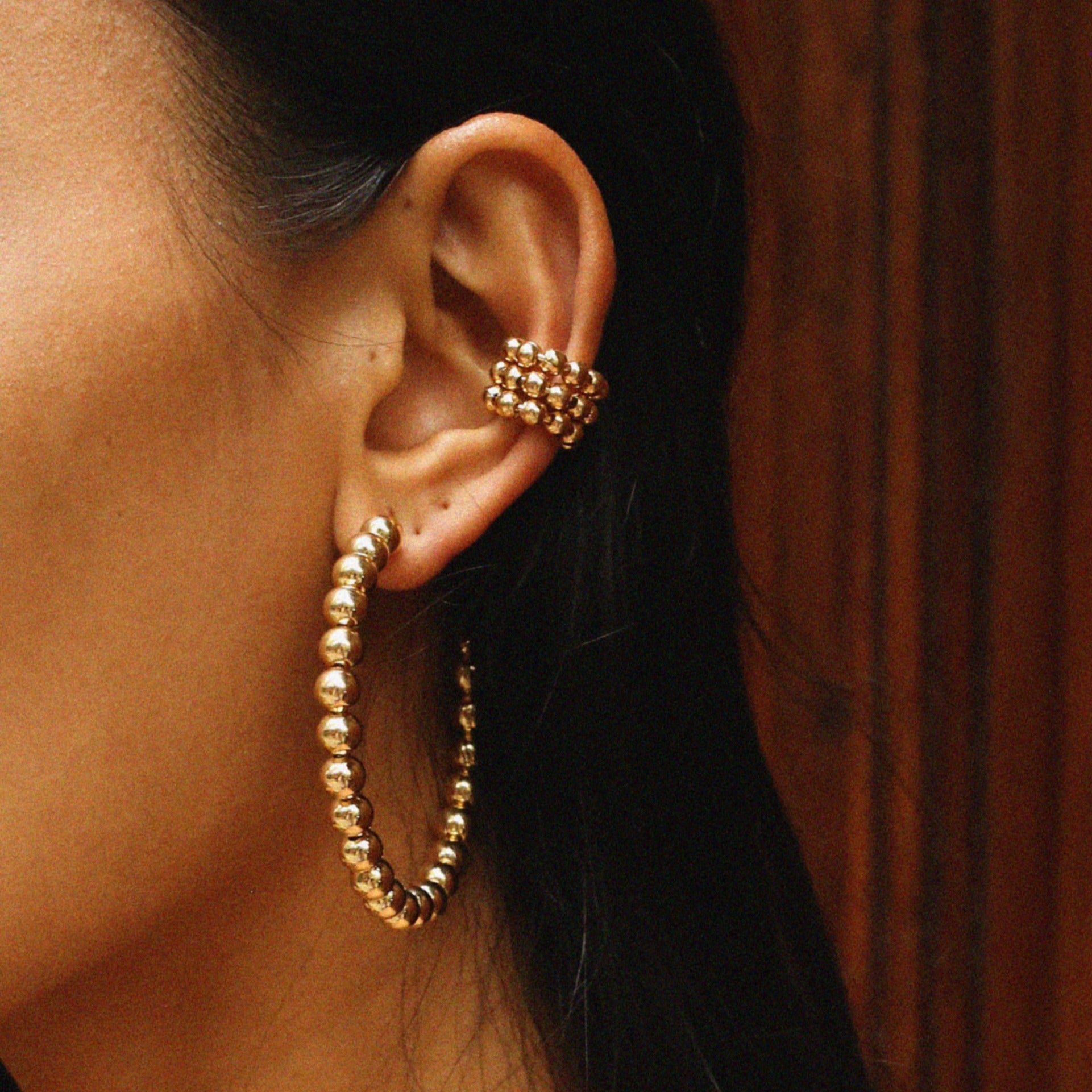 These Cornelia Gold Ball Hoop TRES GRANDE Earrings features endless hollow Gold Spheres and punch a huge impact on your hoop game! If you're looking to stand out in a crowd these will certainly will grab attention!