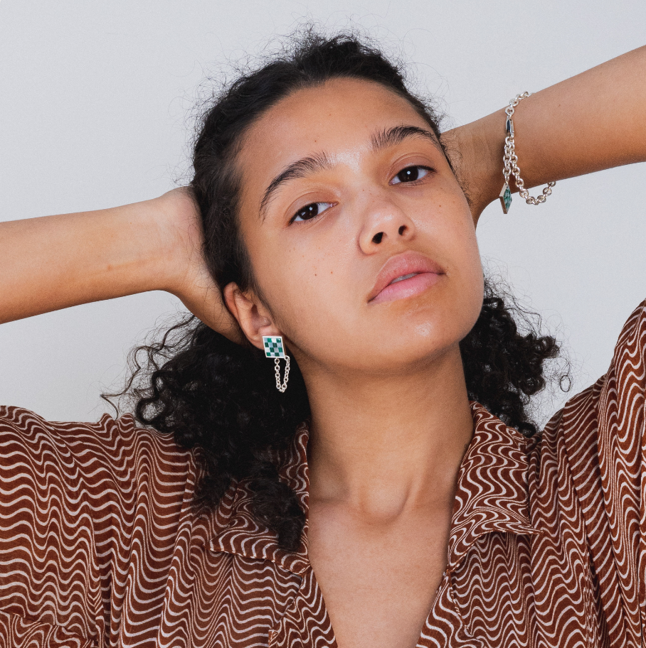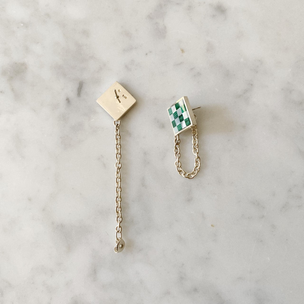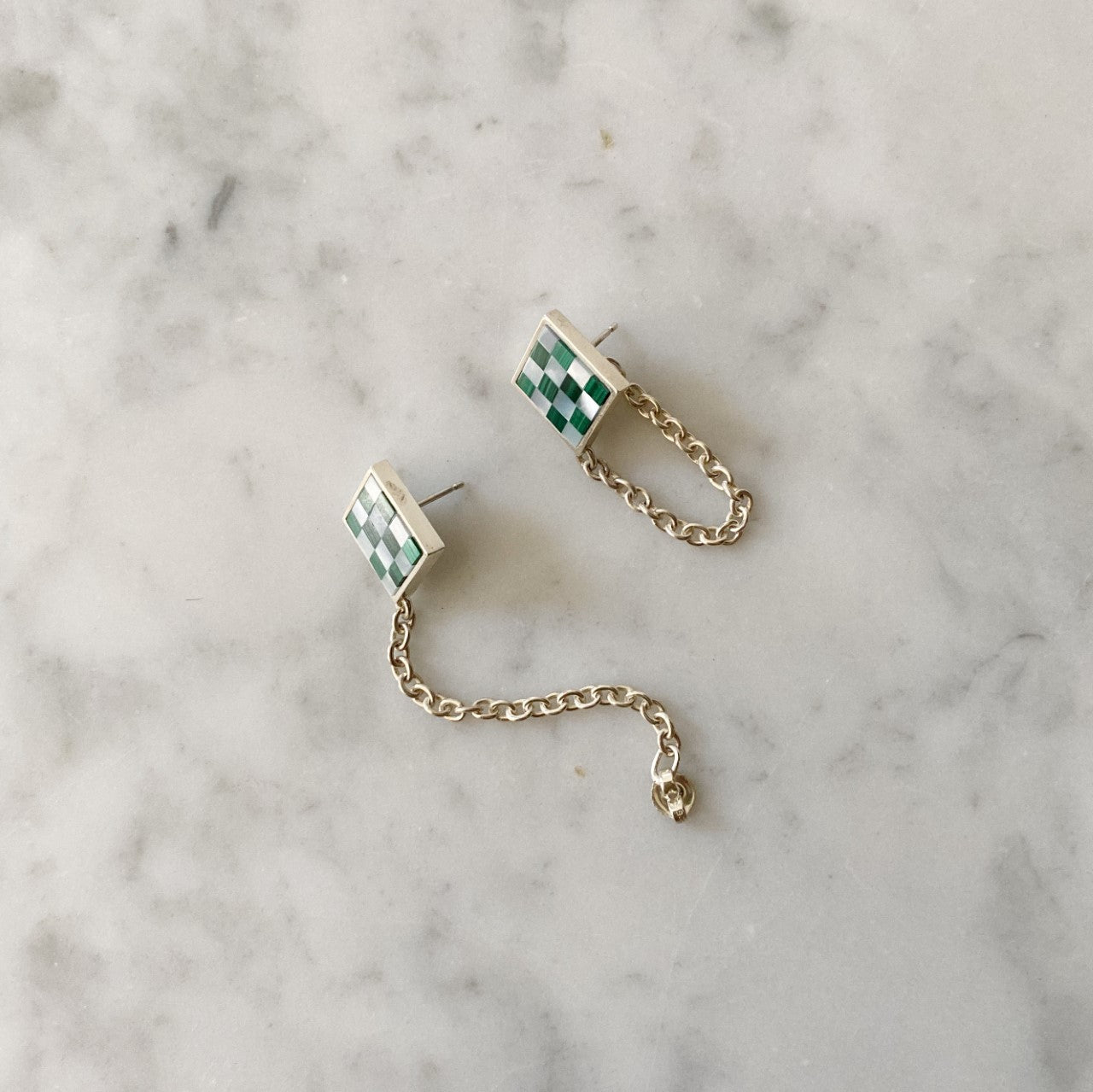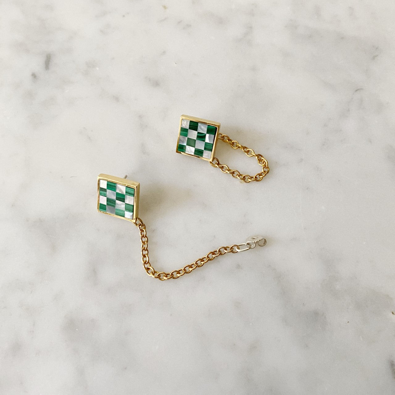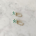 Bored of the usual stud or hoop earrings? Us too. Meet the Chain Earrings with the Samuel Mini Checkered. These earrings have our classic checkered design with a twist, made of white mother of pearl and malachite that will instantly elevate any look.