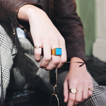 This is our 'Samuel' ring from our flat top Thomas collection. With its flat, square face adorned with a high polished 16x16mm turquoise, the 'Samuel' ring combines practicality and edge. This unisex signet ring is a go-to piece with endless wearability.
